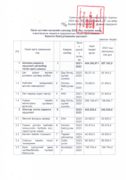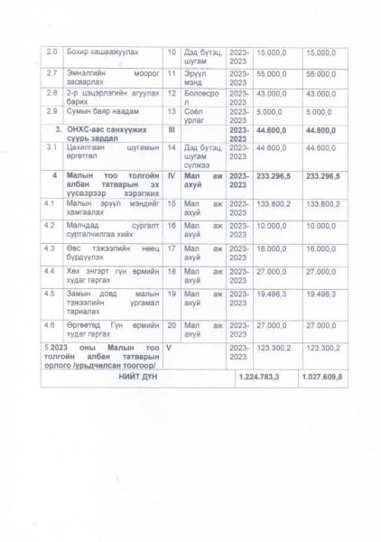 Богд сумын 2023 онд ОНХСан болон МТТАТ-ын эх үүсвэрээр хэрэгжүүлэх төсөл арга хэмжээний жагсаалт